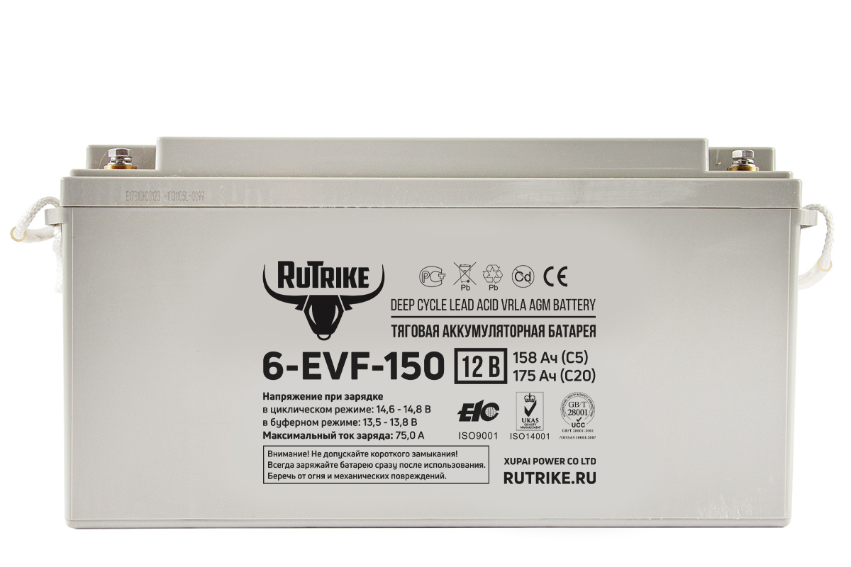 Тяговая аккумуляторная батарея Rutrike 6-EVF-150 поддерживает функцию быстрой зарядки с высокой силой тока до 75 Ампер, однако постоянно прибегать к быстрой зарядке мы не рекомендуем, поскольку количество рабочих циклов при постоянной зарядке с высокой силой тока снижается.