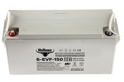 Rutrike 6-EVF-150 - необслуживаемая аккумуляторная батарея с системой рекомбинации газов (VRLA) произведенная по технологии AGM. Батареи выполнены по технологии внутреннего формования. В свинцовых пластинах, имеющих большую толщину по сравнению со стандартными аккумуляторами, используется экологичный запатентованный сплав без кадмия и мышьяка. Плотный сепаратор из углеволокна пропитан электролитом, изготовленным по технологии NANO GEL. Электролит находится в сгущенном состоянии, не даёт утечек и не требует долива воды на протяжении всего срока эксплуатации.